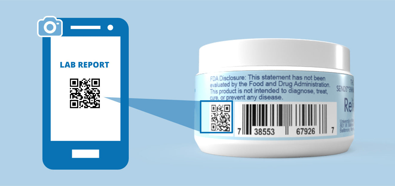 On every Reliefta product, you will find a QR code you can scan on your smartphone. After scanning the code, you will be prompted to click a web address where the Lab Reports can be found.